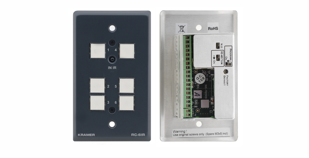 Kramer RC-6IR (RC-6IRE для европейского типоразмера) - устанавливаемая на стену панель управления системами презентационного зала: аудио- и видеоаппаратурой, освещением, экраном. Прибор имеет шесть программируемых кнопок.