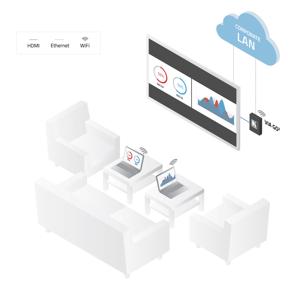 - К VIA GO² могут подключиться до 254 пользователей. Благодаря реализованной в линейке VIA концепции BYOD (Bring Your Own Device (Принеси свое личное устройство)) к VIA GO² можно подключить устройства Apple и Android, а также ноутбуки Windows и Chromebook®, используя встроенный Wi-Fi роутер или локальную сеть Ethernet.