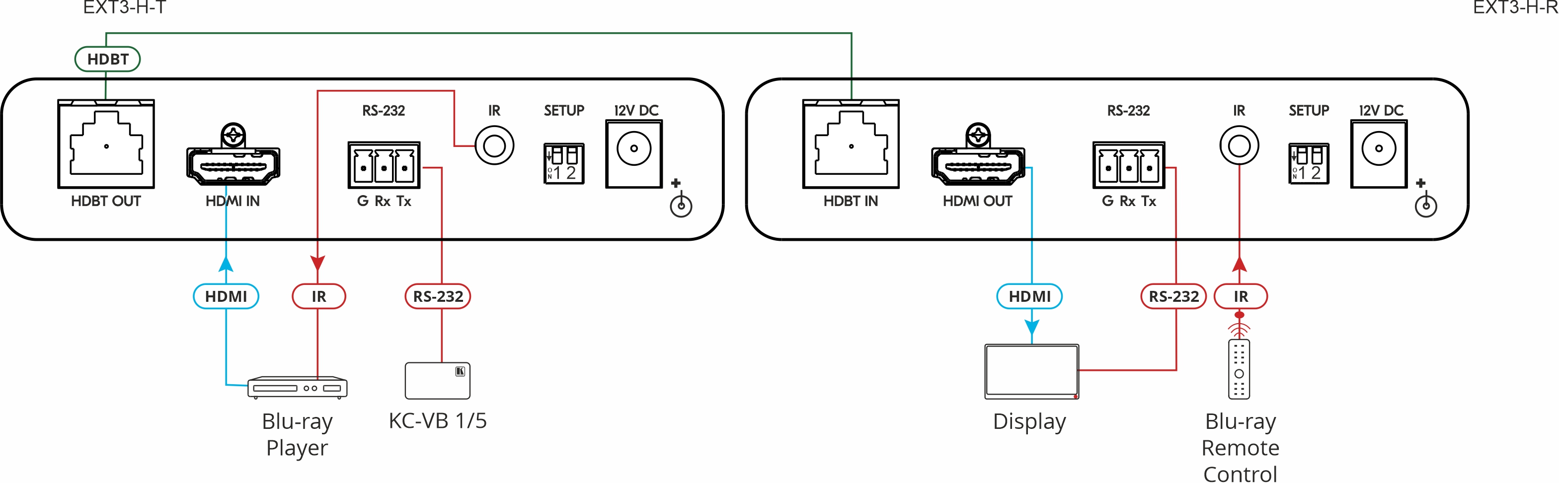 EXT3-H-R — приемник сигналов 4K60 (4:4:4) Гц HDR HDMI, RS−232 и ИК по кабелю витой пары в соответствие со стандартом HDBaseT 3.0. Прибор преобразует поступающий на его вход по кабелю медной витой пары сигнал HDBaseT 3.0 от совместимого передатчика в исходные видеосигнал и сигналы управления. Максимальное расстояние передачи составляет 40 м для видеосигналов разрешением до 4K@60 (4:4:4).
